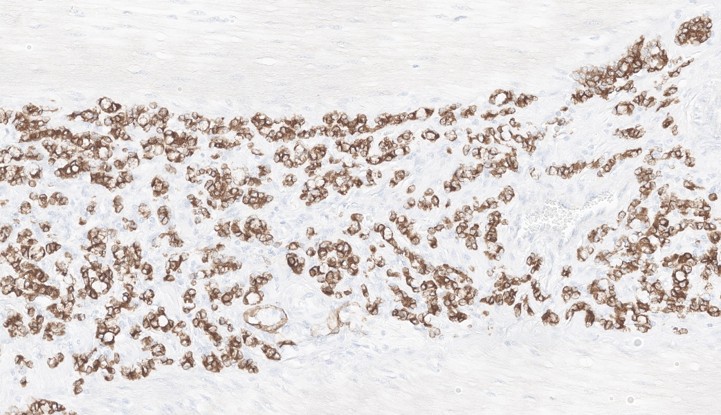 Despite being able to reach a diagnosis, most participants struggled with the specific anatomic location for this tissue. After much back and forth, the consensus amongst conference-goers was that this is likely representative of the ileocecal junction or close to it, since there are features of both small and large intestine on opposite ends of the H&E slide. While there are crypts, mucus glands, and subcutaneous fat consistent with large intestine visible on one side, there are also villi on the other, most clearly seen associated with and around the neoplasm.
