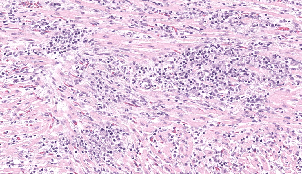 Expanding and infiltrating all layers of the heart, with the greatest severity in the myocardium, are large numbers of plasma cells, lymphocytes, and macrophages. Cardiomyocytes in areas of inflammation are multifocally hypereosinophilic, shrunken, and have striation loss with fragmented to absent nuclei (necrosis). There is mild, multifocal, interstitial fibrosis often associated with cardiomyocyte degeneration and inflammation. Throughout the myocardium, there are occasional cardiomyocytes that contain intrasarcoplasmic, variably sized (up to 100 μm in length) pseudocysts with numerous, 2-3 μm, round protozoal amastigotes.Contributor's Morphologic Diagnoses: