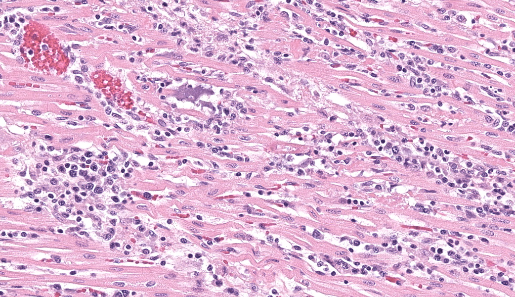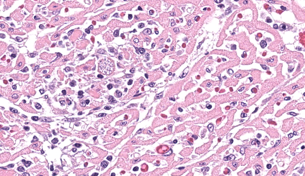 The histologic findings within the heart are most consistent with the protozoal organism, Trypanosoma cruzi, also known as Chagas disease or American trypanosomiasis. Trypanosoma cruzi is a flagellate protozoan organism that primarily harbors in an insect vector of the Triatominae family, most commonly the kissing bug or triatomine bug.5,8-10 It affects a variety of mammalian species across South, Central, and North America, including humans, domestic animals, and non-human primates.5,8-10 It is estimated that approximately 8 million people worldwide have this disease, and around 280,000 reside within the United States.5 Between 60 to 70% of people infected with T. cruzi will never develop clinical signs or symptoms, the remaining 30-40% will develop chronic symptomatic forms within 10 to 30 years.8The life cycle of T. cruzi is complex and begins when the triatomine bug feeds on a host’s blood infected with trypomastigotes. Once in the insect’s midgut, the trypomastigotes differentiate into the epimastigote form where they later become the infective metacyclic trypomastigotes at the rectal ampulla.5 The infective trypomastigotes are then excreted into the feces. As the now-infected bug moves on to its next victim, it will take a blood meal from the host and subsequently defecate near the bite wound. In humans, triatomine bugs will frequently bite along the face and near the mouth, hence their name “kissing bug”, due to their attraction to the carbon dioxide and warmth produced by the face. The parasites can then enter through the mucous membranes, the bite wound, or a cut/abrasion to the skin, as infected hosts will often scratch at the time of the bite. Once in the bloodstream, the metacyclic trypomastigotes will invade the host cells and begin the intracellular transition to amastigotes. Amastigotes will replicate by binary fission differentiating back to metacyclic trypomastigotes and rupturing the cell making their way back into the bloodstream.