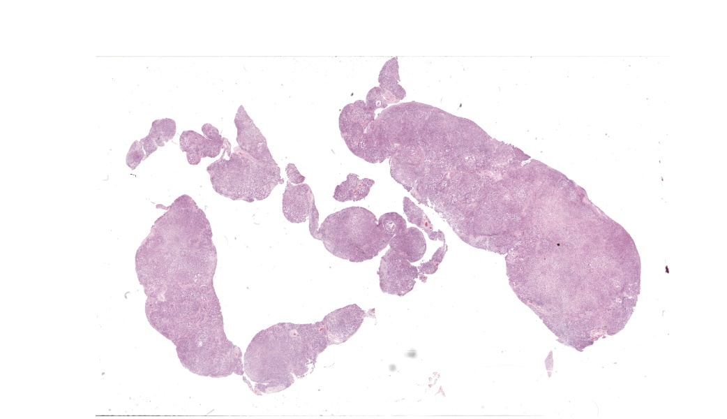 Externally the animal was emaciated. There was 24.5L of red watery peritoneal fluid, and 500ml of red watery pleural fluid. There were multifocal to coalescing exophytic, papillary, white nodules ranging from pinpoint to 5x5x2cm on the abdominal and thoracic body walls, the diaphragm, the omentum, the mesentery, the lung, the liver, the spleen, the peri-renal adipose tissue, and the ovary. The nodules were frequently associated with multifocal to coalescing hemorrhages.