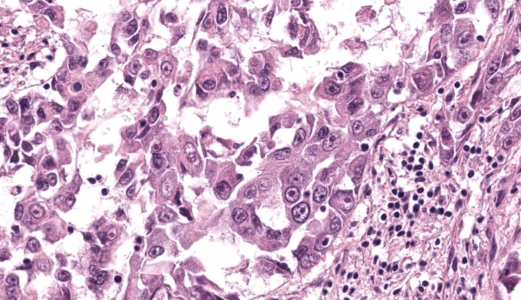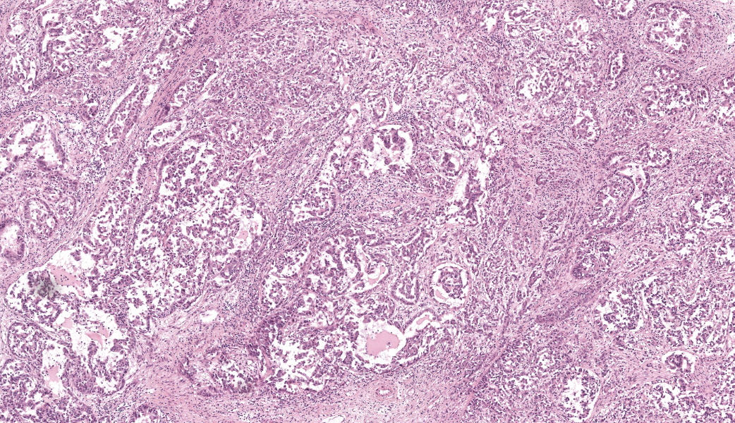 Extending from and infiltrating the omentum is an unencapsulated, poorly demarcated, moderately cellular neoplasm composed of cuboidal to polygonal cells arranged in acini, tubules and nests, and more rarely micropapillary projections, on a moderate fibrovascular stroma. Neoplastic cells have variably distinct cell borders, an abundant amount of granular, eosinophilic and occasionally indistinctly vacuolated cytoplasm, and a pleomorphic, centrally placed nucleus with finely stippled to marginated chromatin and up to 3, occasionally very large distinct magenta nucleoli. There is marked anisocytosis and anisokaryosis, and 21 mitotic figures in 2.37mm2 – equivalent of 10 high power fields (40x obj); these are occasionally bizarre. There are occasional multinucleated neoplastic cells with up to 3 nuclei which occasionally compress and occasional apoptotic bodies are seen. Multifocally, neoplastic stroma contains minimal extravasations of erythrocytes (haemorrhage), and there are multifocal mild infiltrations of deform adjacent nuclei (nuclear molding).