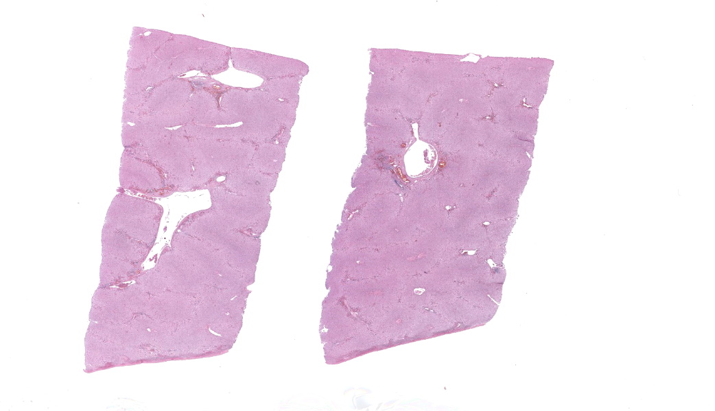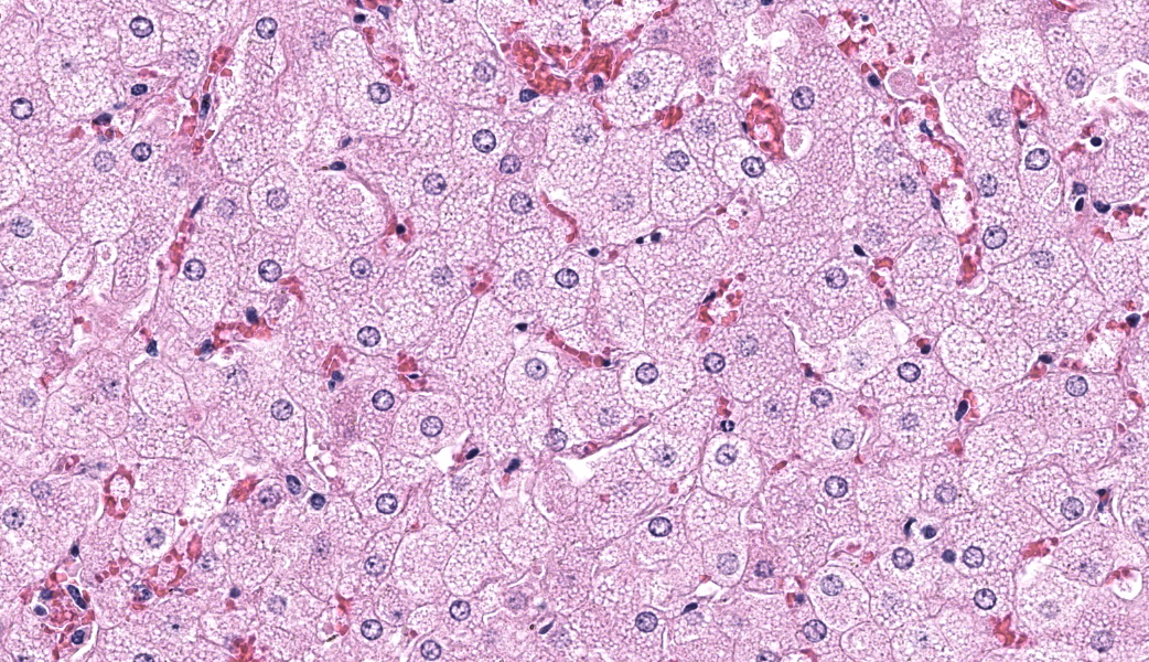 Liver: Diffusely, hepatocytes are moderately swollen and contain numerous small (~1µm) discrete to coalescing cytoplasmic vacuoles (microvesicular hepatopathy). Nuclei remain centrally located. Within the centrilobular interstitium, hepatocytes are occasionally individualized, rounded, shrunken, and/or hypereosinophilic with karyolysis (necrosis). There is mild, patchy periportal hemorrhage.