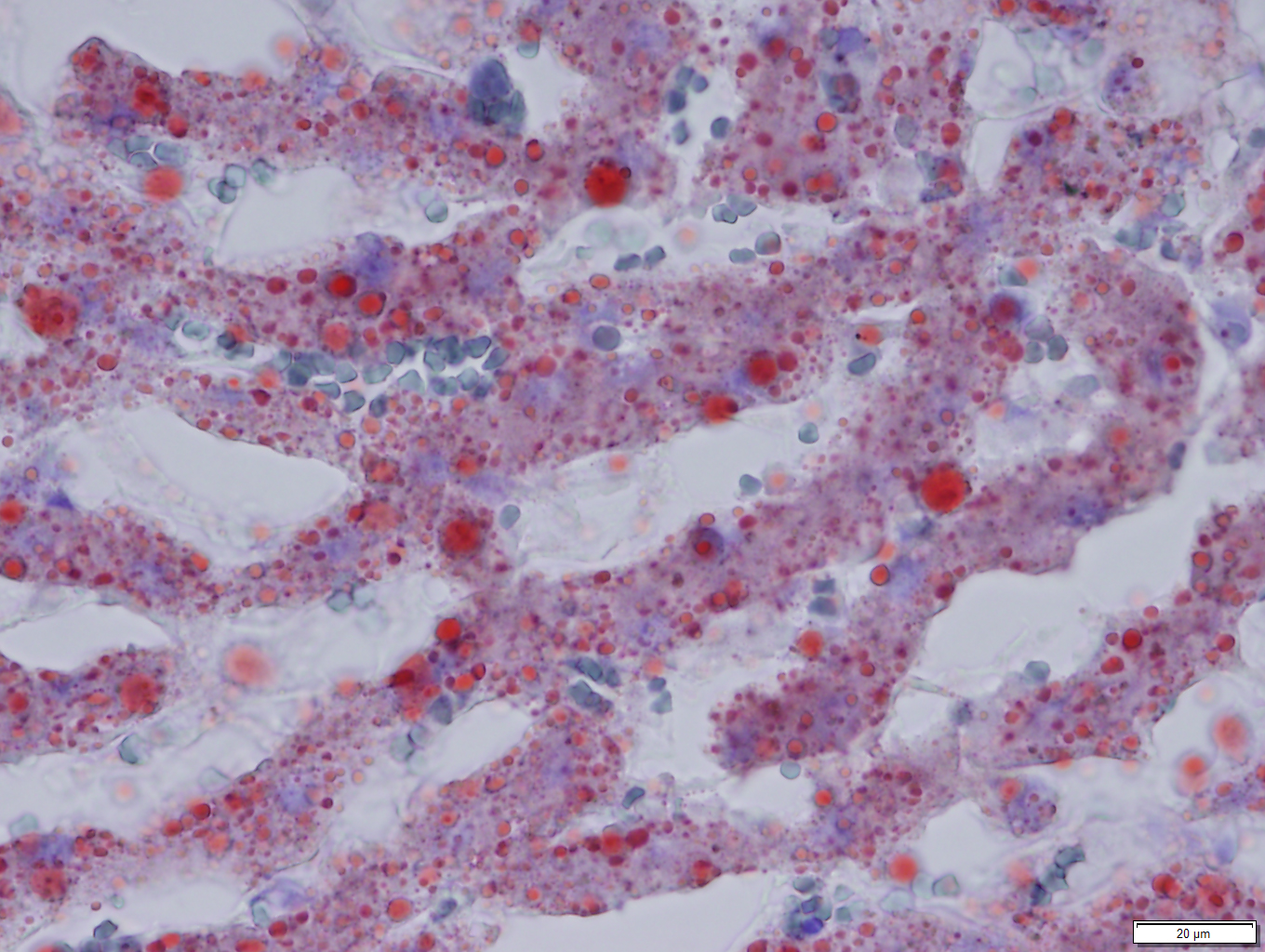 Oil Red O revealed prominent staining of microvesicular lesions, again confirming the vacuoles as lipid droplets.